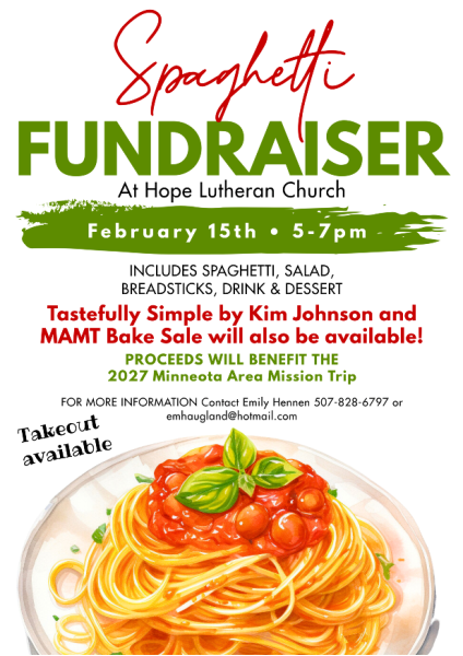 February 15—Mission Trip Spaghetti Supper Fundraiser, 5-7 pm
